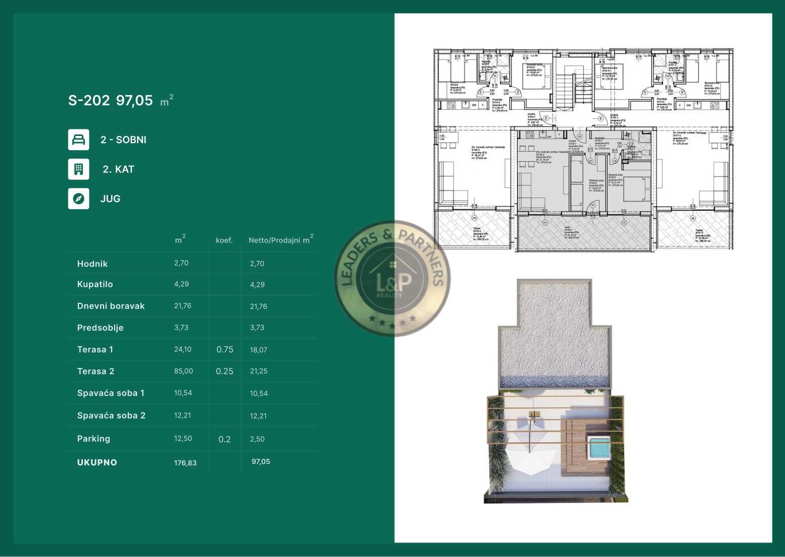 Pozostáva z dvoch spální, obývacej izby + kuchyne + jedáleň, chodby, kúpeľne a krytej terasy.