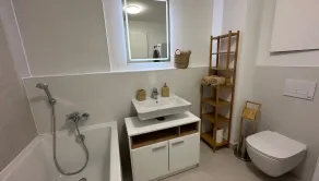 → Vybavenie: bezpečnostné dvere, vstavané skrine, klimatizácia, kuchynská linka so spotrebičmi (rúra, mikrovlnka, umývačka, indukčná doska), práčka a sušička