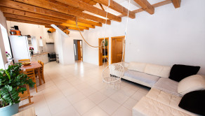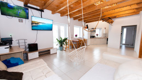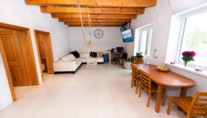 Dispozične dom pozostáva zo vstupnej chodby , kúpeľňa so sprchovým kútom a toaletou , detská izba , spálňa , obývacia miestnosť s kuchyňou. Hornú časť domu tvoria drevené trámy , ktoré slúžia ako pochôdzna povala taktiež to môžete využívať aj ako pracovňa.