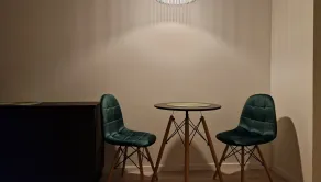 → Obývacia miestnosť s posteľou, stolom, stoličkami a skrinkou