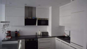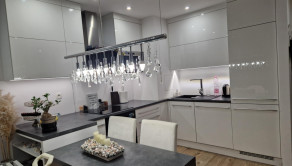 otvorená kuchyňa so spotrebičmi prepojená s obývačkou a francúzskym oknom