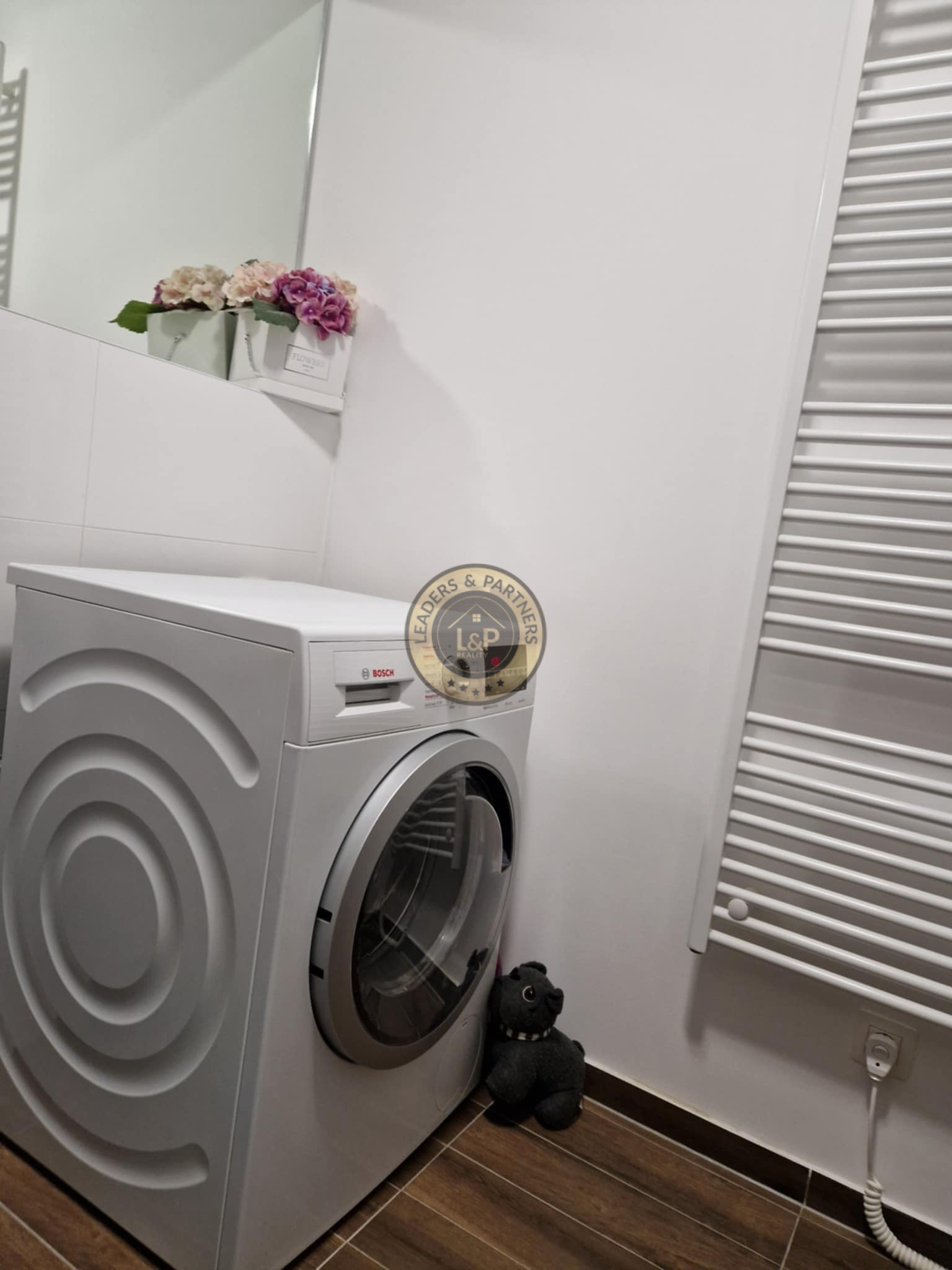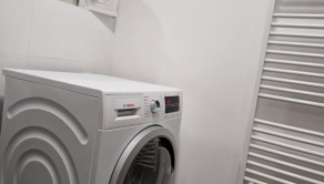 samostatná kúpeľňa s vaňou, skrinkou a kombinovanou práčkou so sušičkou