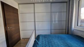 spálňa so vstavanou rolldoor skriňou a TV