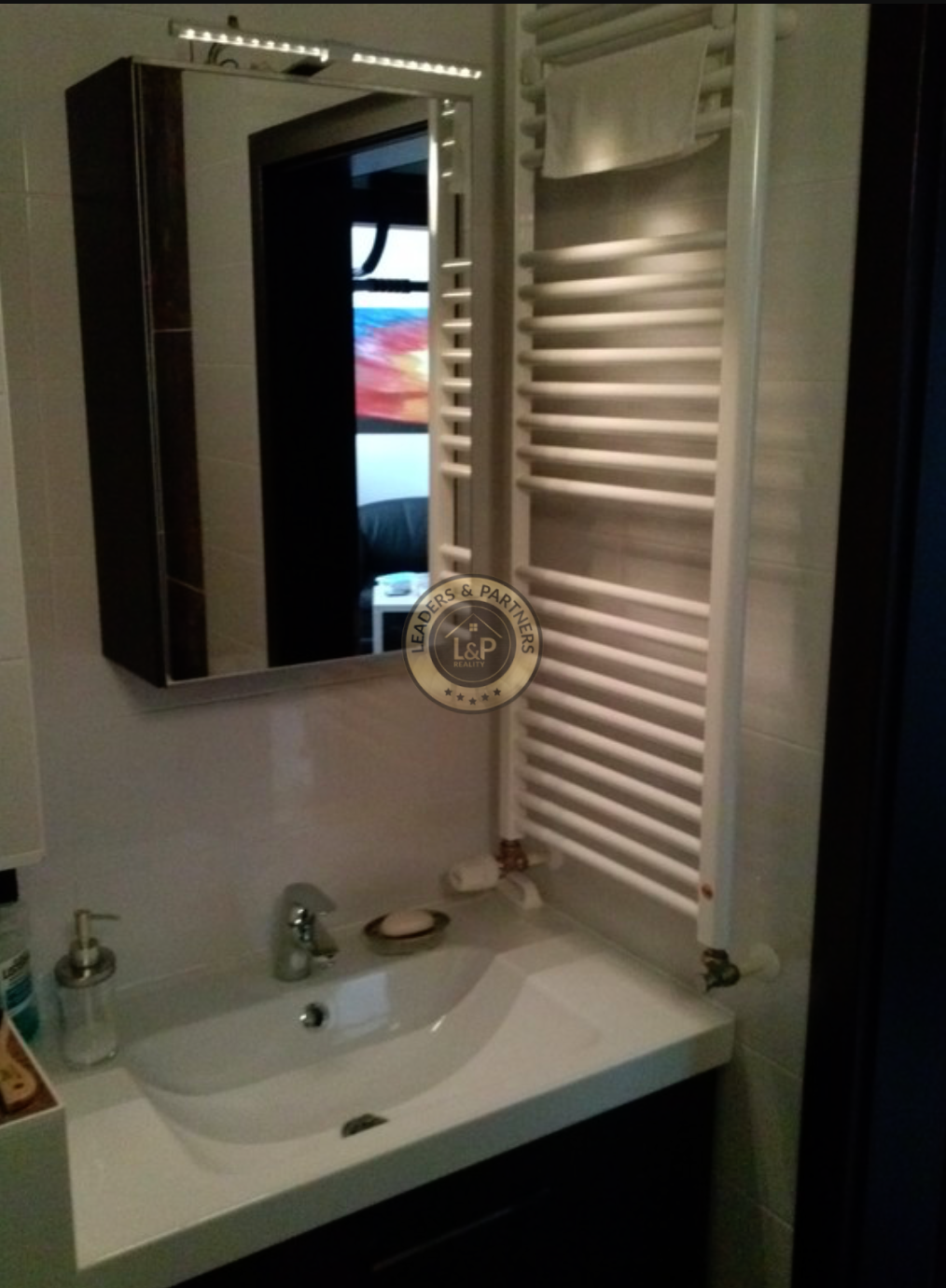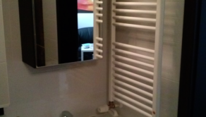 → kúpeľňa so sprchovacím kútom, umývadlom, skrinkou a zrkadlom