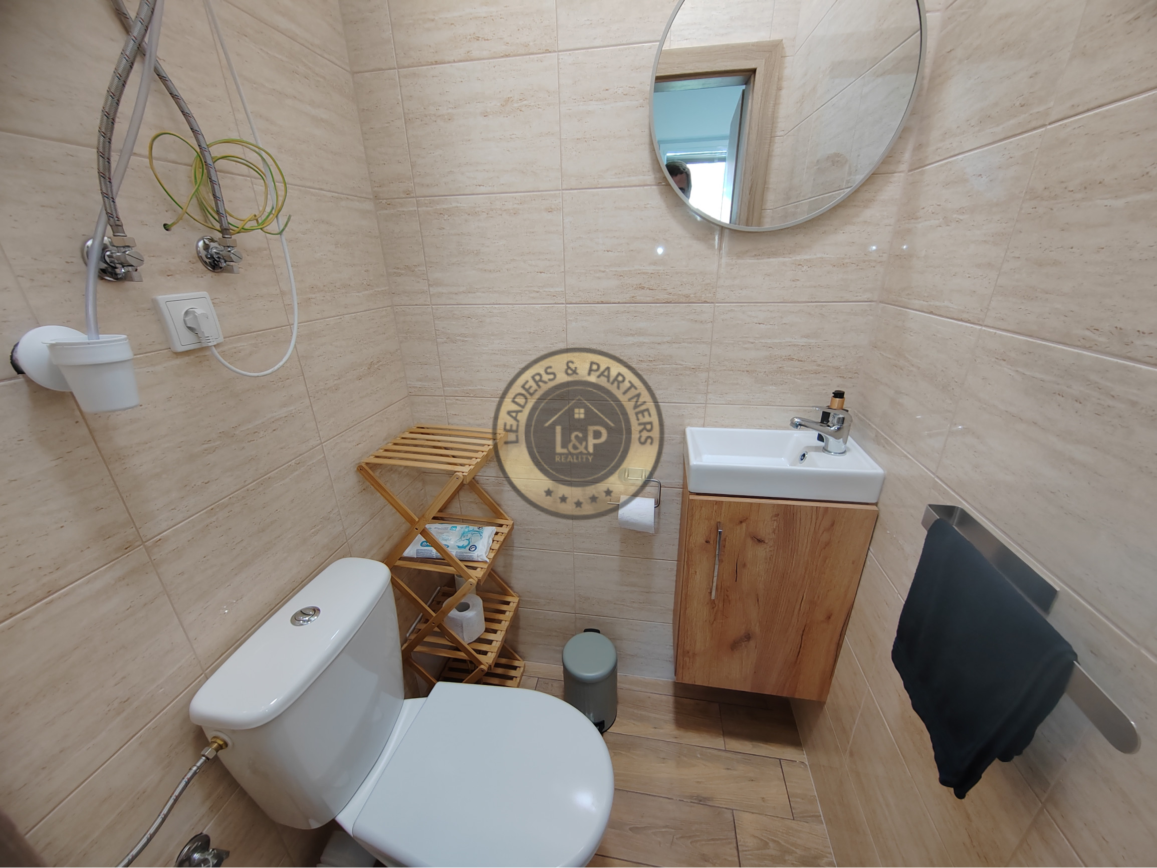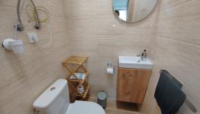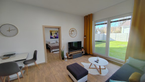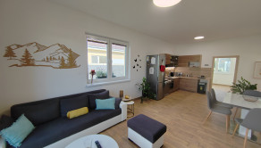 Vstupná chodba s vešiakovou stenou a botníkom, kúpeľňa s vaňou, sprchovým kútom, umývadlom, WC a práčkou. Technická miestnosť. V prednej časti domu sú 2 izby so skriňou a komodou. Kuchyňa je prepojená s obývacou izbou, z ktorej je východ do záhrady. Kuchyňa je plne vybavená spotrebičmi – chladnička, digestor, mikrovlnka, indukčná varná doska, elektrická rúra, teplovzdušná fritéza, umývačka riadu, rýchlovarná kanvica. Tak isto je tu kompletné vybavenie riadmi na varenie, taniermi, pohármi a príbormi. Jedálenský stôl so 4 stoličkami. V obývačke je rozťahovací gauč s úložným priestorom, konferenčný stolík a smart TV. Z obývačky je vstup do spálne so samostatnou toaletou s WC s bidetovou sprchou a umývadlom. V spálni je vstavaná skriňa, komoda a manželská posteľ s nočnými stolíkmi.