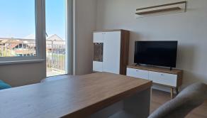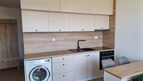 Súčasťou obývačky je kuchynská linka, raňajkový stolík, vstavané spotrebiče a práčka. Obývacia časť je tvorená rozkladacou sedačkou, konferenčným stolíkom, komódou, TV na tv stolíku. Z obývačky prejdete priamo na balkón s výhľadom na záhradky.