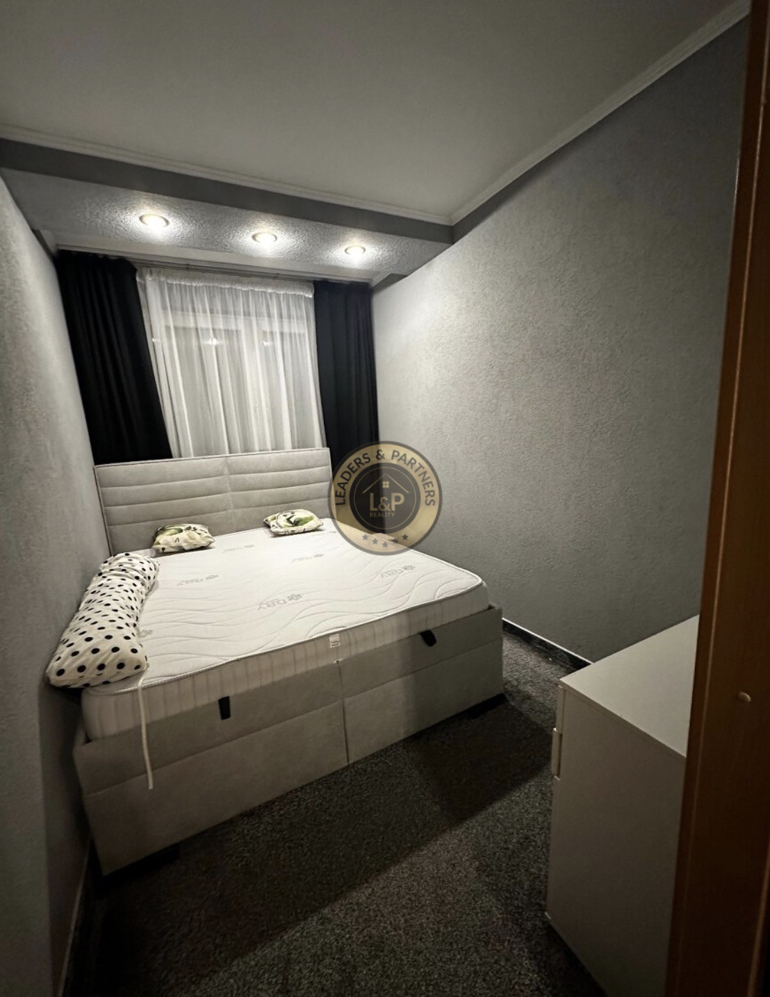 → Spálňa: boxspringová posteľ, komoda, zatemňovacie závesy